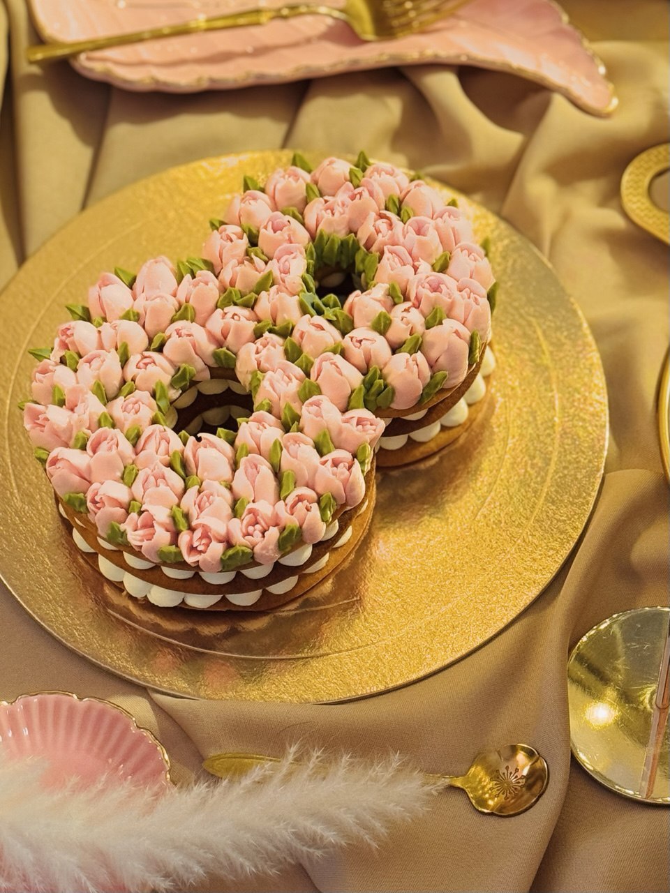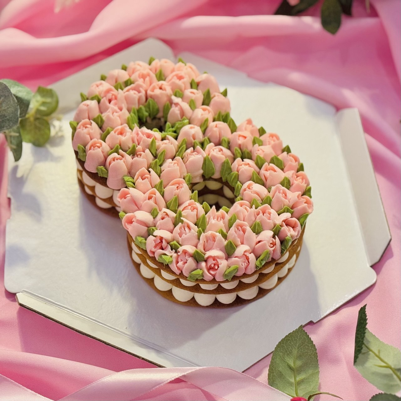 - Эстетичный декор: розовые кремовые тюльпаны, выполненные вручную, превращают торт в произведение искусства.